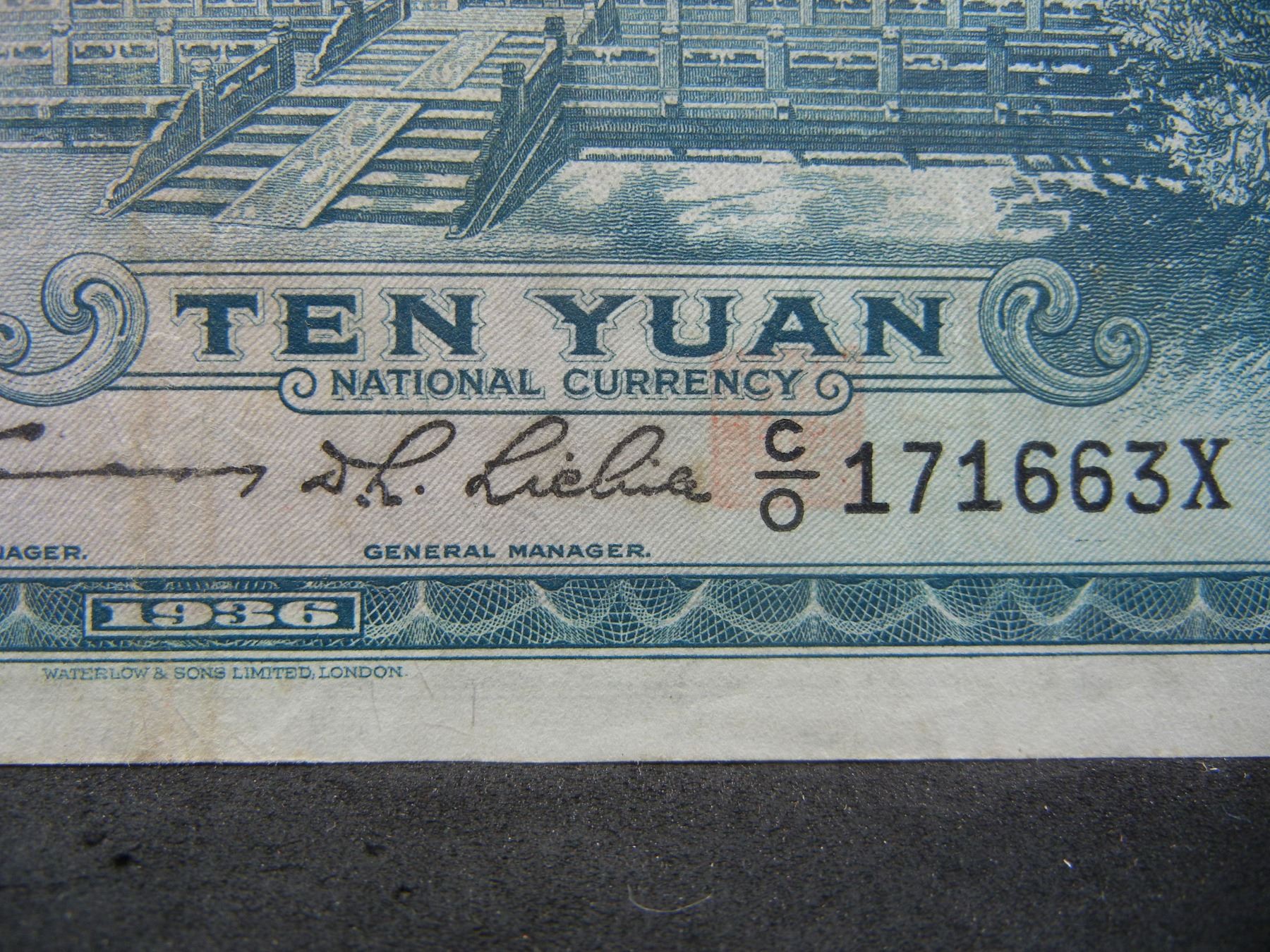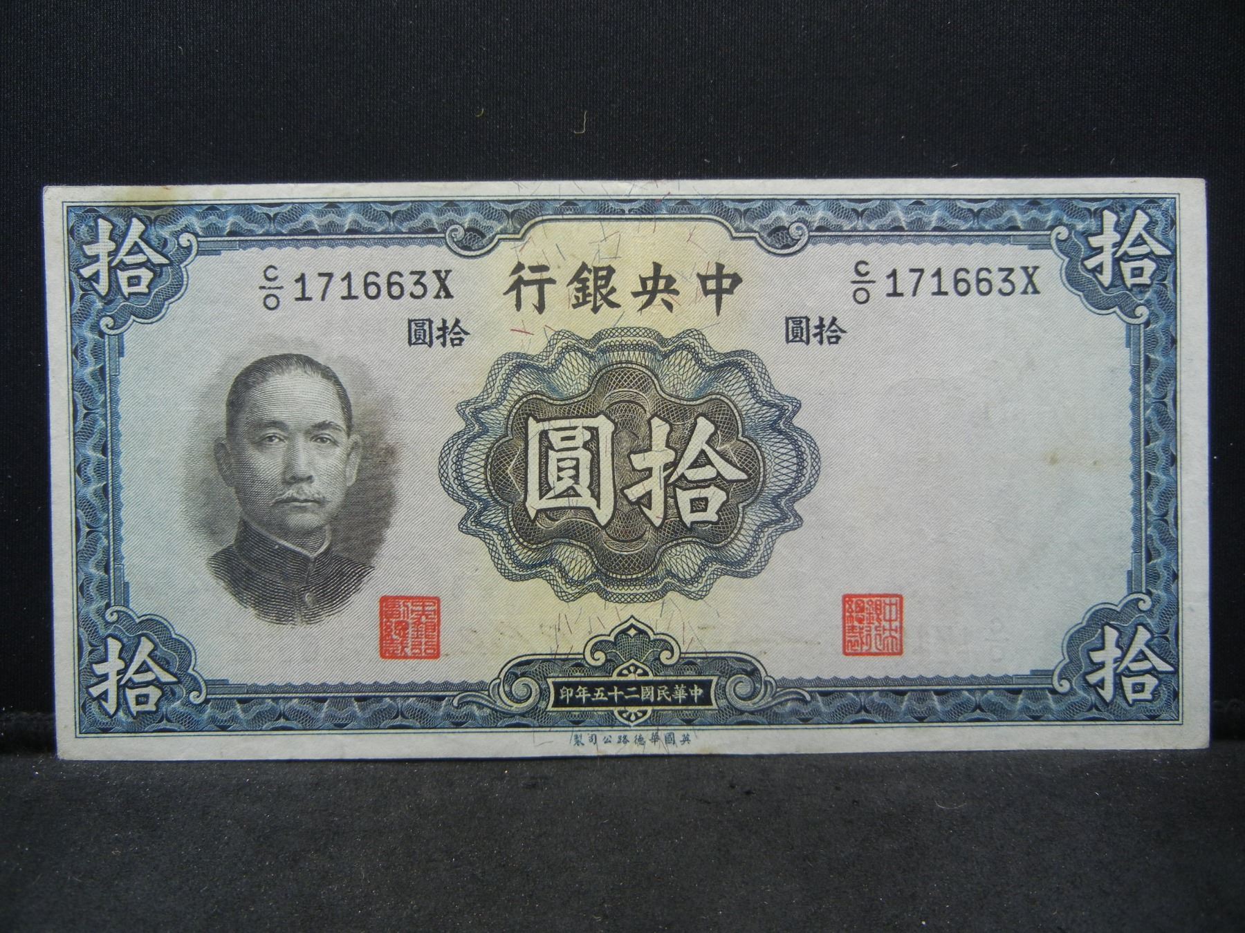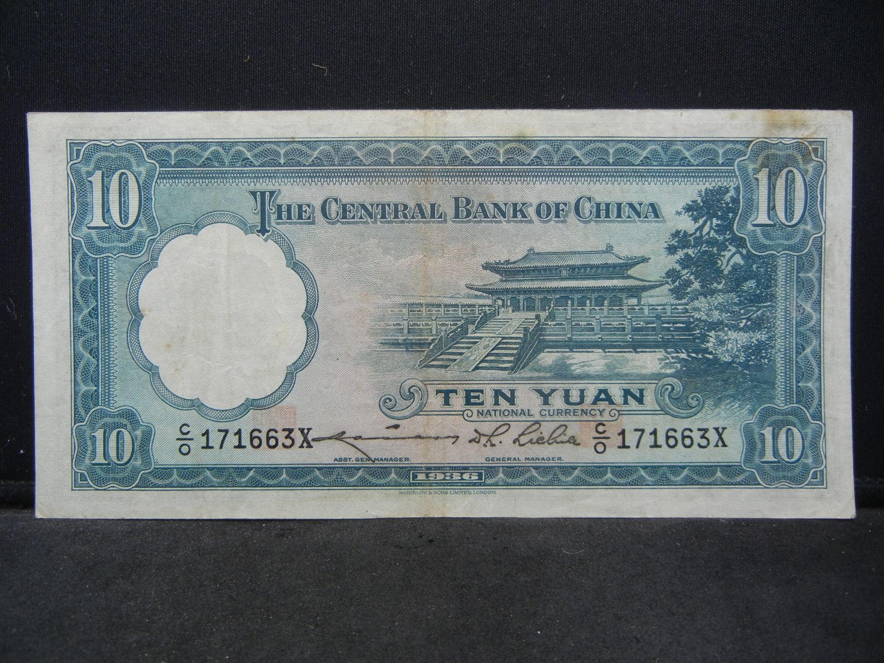1936 China Central Bank 10 Yuan. Extra Fine. Very early note and pretty