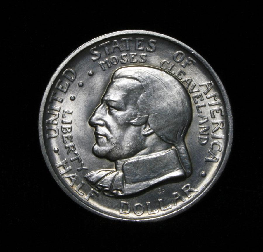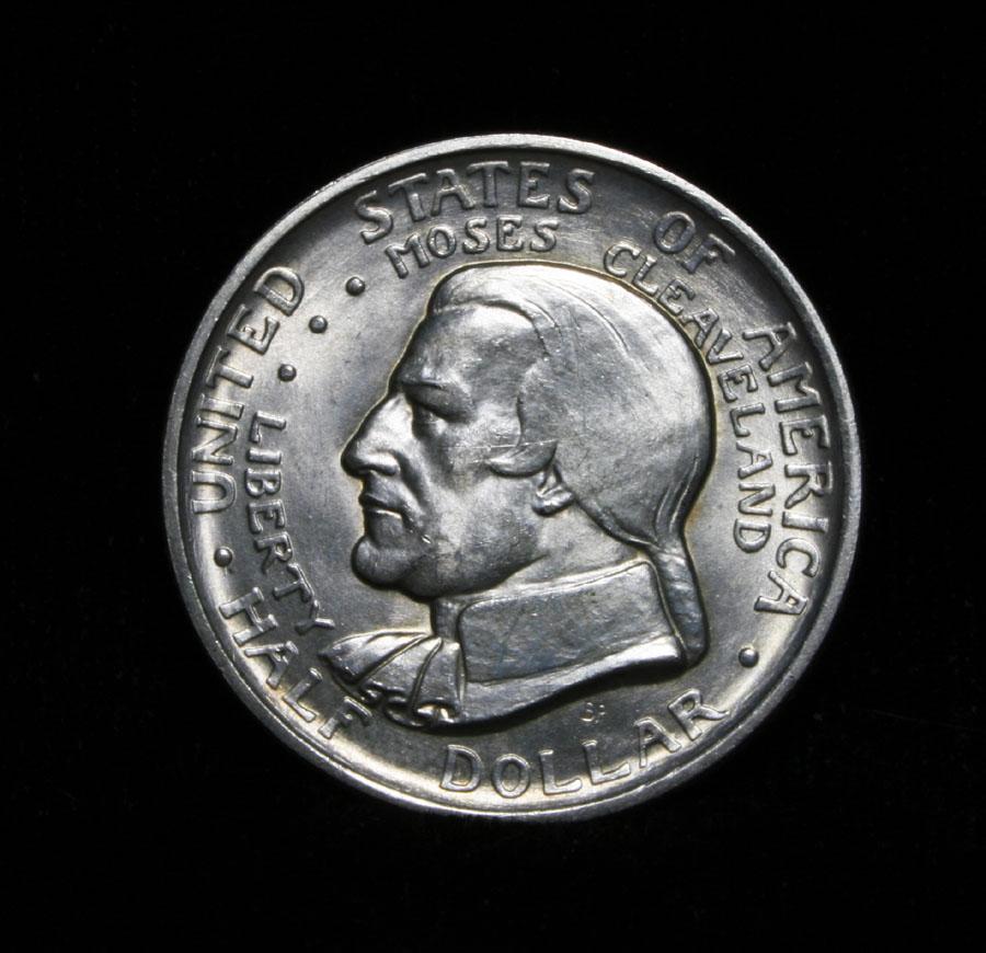 A beautiful example with a light golden toning. The High points on a Cleveland Half are the Top of the compass on the Reverse and the Cheekbone of the obverse, Look there when trying to see if there is any wear and whether you are looking at an Unc or an au58. Coin World's Coin Values lists ms65 at $200 and The Wholesale Greysheet lists ms65 at $130. Estimated Value $150