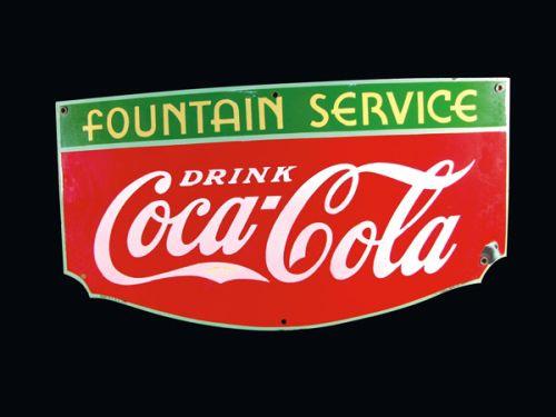 1936 Coca Cola Porcelain Sign, Fountain Service. Chip at bottom right grommet otherwise excellent condition. 27 X 14 inches.