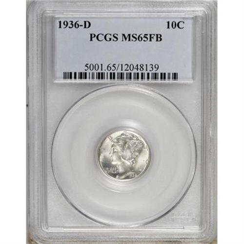<B>1936-D 10C MS65 Full Bands PCGS.</B></I> PCGS Population (295/296). NGC Census: (91/74). Mintage: 16,132,000. Numismedia Wsl. Price for NGC/PCGS coin in MS65: $260. (#5001)<BR><BR><B>Coin Engraver:</B> Adolph A. Weinman<BR><BR><b>Shipping:</b> Coins & Currency (<a target="_blank" href="http://www.heritageauctions.com/common/shipping.php">view shipping information</a>)
