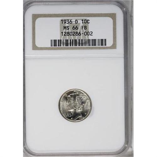<B>1936-D 10C MS66 Full Bands NGC.</B></I> NGC Census: (55/19). PCGS Population (185/121). Mintage: 16,132,000. Numismedia Wsl. Price for NGC/PCGS coin in MS66: $340. (#5001)<BR><BR><B>Coin Engraver:</B> Adolph A. Weinman<BR><BR><b>Shipping:</b> Coins & Currency (<a target="_blank" href="http://www.heritageauctions.com/common/shipping.php">view shipping information</a>)