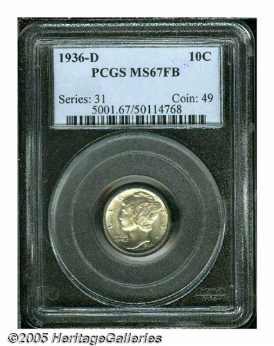 <B>1936-D<10C> MS67 Full Bands PCGS.</B></I> A lightly toned and highly lustrous Superb Gem that has a full strike and impressive preservation. A Mercury Dime that is certain to please even the most demanding specialist. Population: 71 in 67, 5 finer (5/05).