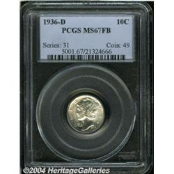 <B>1936-D<10C> MS67 Full Bands PCGS.</B></I> This Superb Gem has fully brilliant luster with sharp design elements and frosty luster. Any Mercury dime collector would be proud to add this example to his or her set. Population: 59 in 67, 4 finer (7/04). <BR><BR><B>Important notice:</B> Heritage usually auctions material at the rate of 200-250 lots per hour. On some occasions eBay Live bid software or the Internet may not be able to keep up with the pace of the auction. We recommend placing a realistic absentee bid now as insurance to avoid disappointment. Occasionally the auctioneer may eliminate or reject an eBay Live bid, and the auctioneer may also reopen a lot after the close of the eBay live bidding (usually because we missed an audience bid), and may reject your bid even if it shows you as the winning bidder. By bidding via eBay Live, you agree that Heritage may award the lot to another bidder at its sole discretion under the circumstances described above or any other reasonable circumstances. Since eBay bids are not shown to us until we open the lot on the floor, we treat those bids just like floor bids. In most cases the floor responds before the eBay bid is presented to us, due to Internet lag time, so for consistency we have made it a policy that floor bids are always considered first over tie eBay live bids. Also please note that all Heritage lots purchased through eBay Live carry a 20% Buyer's Premium. Please make sure you read the Terms and Conditions before you bid. </span></font></tr></table></td></tr></table>