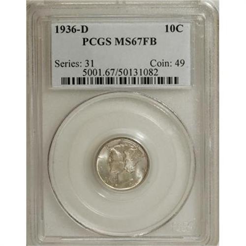 <B>1936-D 10C MS67 Full Bands PCGS.</B></I> Subtle yellow-gold and salmon-pink patina graces the obverse, while dusky apple-green and plum-mauve adorn the reverse. Sharply struck and unblemished. PCGS has certified only seven pieces finer (8/07).<BR><BR><B>Coin Engraver:</B> Adolph A. Weinman<BR><BR><b>Shipping:</b> Coins & Currency (<a target="_blank" href="http://www.heritageauctions.com/common/shipping.php">view shipping information</a>)