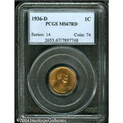 1936-D 1C MS67 Red PCGS. A splendidly lustrous, be <B>1936-D 1C MS67 Red PCGS.</B></I> A splendidly lustrous, beautifully toned Superb Gem, with near-pristine surfaces and a bold strike. Population: 57 in 67, 0 finer (11/04).<BR><I>From The Dennis Dewart Collection.</B></I> <BR><BR><B>Important notice:</B> Heritage usually auctions material at the rate of 200-250 lots per hour. On some occasions eBay Live bid software or the Internet may not be able to keep up with the pace of the auction. We recommend placing a realistic absentee bid now as insurance to avoid disappointment. Occasionally the auctioneer may eliminate or reject an eBay Live bid, and the auctioneer may also reopen a lot after the close of the eBay live bidding (usually because we missed an audience bid), and may reject your bid even if it shows you as the winning bidder. By bidding via eBay Live, you agree that Heritage may award the lot to another bidder at its sole discretion under the circumstances described above or any other reasonable circumstances. Since eBay bids are not shown to us until we open the lot on the floor, we treat those bids just like floor bids. In most cases the floor responds before the eBay bid is presented to us, due to Internet lag time, so for consistency we have made it a policy that floor bids are always considered first over tie eBay live bids. Also please note that all Heritage lots purchased through eBay Live carry a 20% Buyer's Premium. Please make sure you read the Terms and Conditions before you bid. This lot is being auctioned in conjunction with a live floor auction by Heritage Galleries & Auctioneers. All final auction and invoice information will be supplied by Heritage Galleries & Auctioneers, and all other information should be considered preliminary. Lot:5181