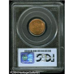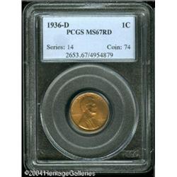 1936-D 1C MS67 Red PCGS. Sharply struck except on <B>1936-D 1C MS67 Red PCGS.</B></I> Sharply struck except on AM of AMERICA, with a coating of beautiful mint frost on both sides, and smooth, expertly preserved surfaces that seem entirely blemish-free on obverse and reverse alike. Population: 57 in 67, 0 finer (10/04). <BR><BR><B>Important notice:</B> Heritage usually auctions material at the rate of 200-250 lots per hour. On some occasions eBay Live bid software or the Internet may not be able to keep up with the pace of the auction. We recommend placing a realistic absentee bid now as insurance to avoid disappointment. Occasionally the auctioneer may eliminate or reject an eBay Live bid, and the auctioneer may also reopen a lot after the close of the eBay live bidding (usually because we missed an audience bid), and may reject your bid even if it shows you as the winning bidder. By bidding via eBay Live, you agree that Heritage may award the lot to another bidder at its sole discretion under the circumstances described above or any other reasonable circumstances. Since eBay bids are not shown to us until we open the lot on the floor, we treat those bids just like floor bids. In most cases the floor responds before the eBay bid is presented to us, due to Internet lag time, so for consistency we have made it a policy that floor bids are always considered first over tie eBay live bids. Also please note that all Heritage lots purchased through eBay Live carry a 20% Buyer's Premium. Please make sure you read the Terms and Conditions before you bid. This lot is being auctioned in conjunction with a live floor auction by Heritage Galleries & Auctioneers. All final auction and invoice information will be supplied by Heritage Galleries & Auctioneers, and all other information should be considered preliminary. Lot:5338