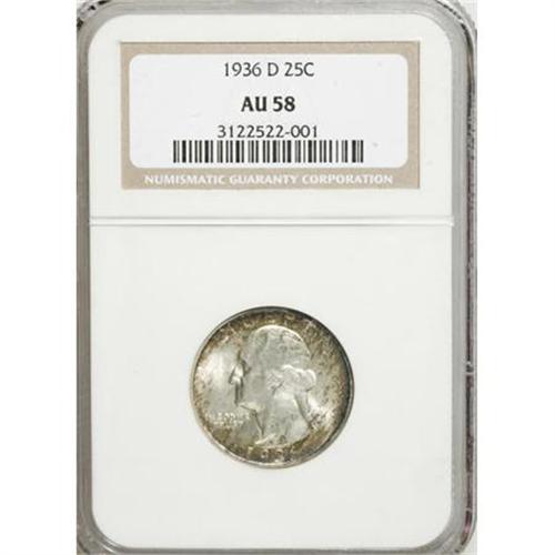<B>1936-D 25C AU58 NGC.</B></I> NGC Census: (63/677). PCGS Population (93/1282). Mintage: 5,374,000. Numismedia Wsl. Price for NGC/PCGS coin in AU58: $221. (#5801)<BR><BR><B>Coin Engraver:</B> John Flanagan<BR><BR><b>Shipping:</b> Coins & Currency (<a target="_blank" href="http://www.heritageauctions.com/common/shipping.php">view shipping information</a>)