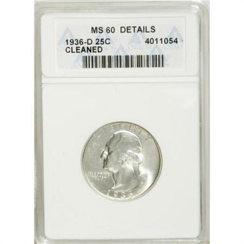 <B>1936-D 25C --Cleaned--ANACS. MS60 Details.</B></I> NGC Census: (0/664). PCGS Population (2/1262). Mintage: 5,374,000. Numismedia Wsl. Price for NGC/PCGS coin in MS60: $442. (#5801)<BR><BR><B>Coin Engraver:</B> John Flanagan<BR><BR><b>Shipping:</b> Coins & Currency (<a target="_blank" href="http://www.heritageauctions.com/common/shipping.php">view shipping information</a>)