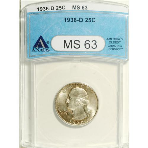 <B>1936-D 25C MS63 ANACS.</B></I> Highly lustrous surfaces are visited by whispers of tan-gold patination, especially on the reverse, and the design elements are well brought up. A few light ticks on Washington's forehead account for the grade.<BR><BR><b>Shipping:</b> Coins & Currency (<a target="_blank" href="http://www.heritageauctions.com/common/shipping.php">view shipping information</a>)
