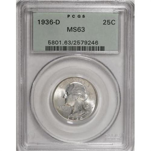 <B>1936-D 25C MS63 PCGS.</B></I> The strongly lustrous surfaces are silver-white save for a touch of milkiness over the obverse. Well-defined for this Denver issue with faint, scattered abrasions that account for the grade.<BR><BR><B>Coin Engraver:</B> John Flanagan<BR><BR><b>Shipping:</b> Coins & Currency (<a target="_blank" href="http://www.heritageauctions.com/common/shipping.php">view shipping information</a>)