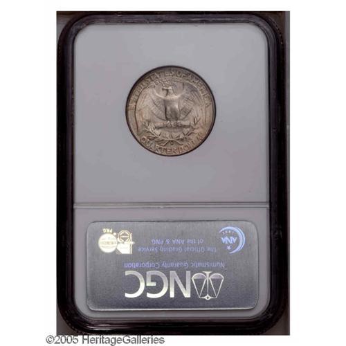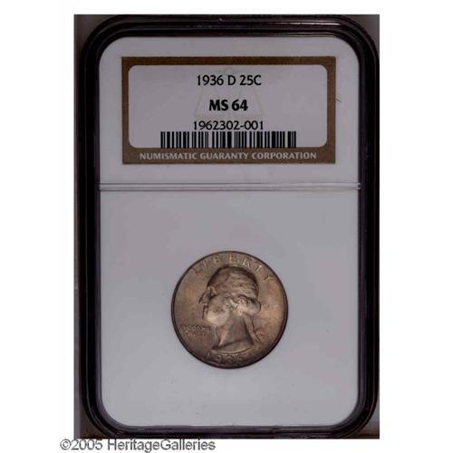 <B>1936-D<25C> MS64 NGC.</B></I> Lovely peach and silver-gray toning adorns each side of this well struck example. Pleasing luster and careful preservation are additional attributes of this attractive near-Gem. After the 1932-D and 1932-S, the 1936-D is the key issue among early dates in the Washington quarter series.
