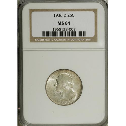 <B>1936-D 25C MS64 NGC.</B></I> Silver-gray, lustrous surfaces display faint ice-blue undertones and occasional splashes of golden-brown, along with some deeper toning spots on the obverse. Well struck on the design elements. A few minor handling marks are noted on Washington's neck. The '36-D becomes scarce in the higher grades of Mint State.<BR><BR><b>Shipping:</b> Coins & Currency (<a target="_blank" href="http://www.heritageauctions.com/common/shipping.php">view shipping information</a>)