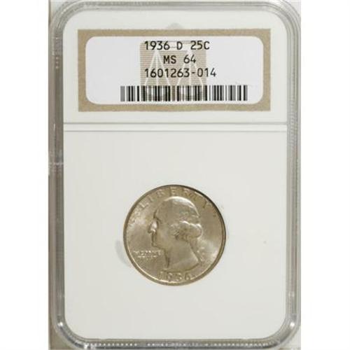 <B>1936-D 25C MS64 NGC.</B></I> NGC Census: (260/191). PCGS Population (541/382). Mintage: 5,374,000. Numismedia Wsl. Price for NGC/PCGS coin in MS64: $1,040. (#5801)<BR><BR><B>Coin Engraver:</B> John Flanagan<BR><BR><b>Shipping:</b> Coins & Currency (<a target="_blank" href="http://www.heritageauctions.com/common/shipping.php">view shipping information</a>\)