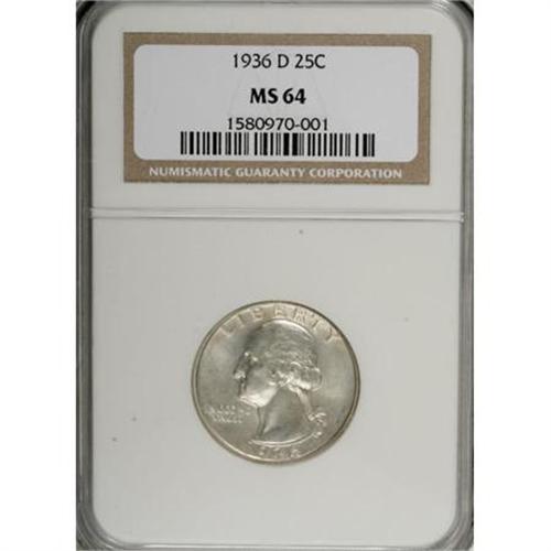 <B>1936-D 25C MS64 NGC.</B></I> Boldly struck with an attractive layer of opaque silver-gray patina over both sides. Faint die polish lines are noted in the fields, and a faint reddish-brown toning streak extends across the eagle's lower left (facing) leg. Third in Mint State rarity for the series, the 1936-D is a highly desirable date. <BR><BR><B>Coin Engraver:</B> John Flanagan<BR><BR><b>Shipping:</b> Coins & Currency (<a target="_blank" href="http://www.heritageauctions.com/common/shipping.php">view shipping information</a>)
