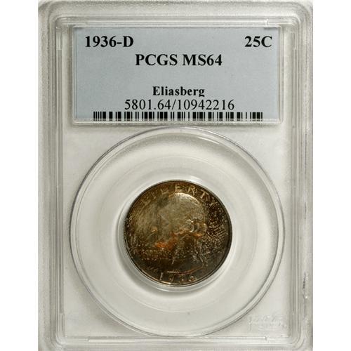 <B>1936-D 25C MS64 PCGS.</B></I> Remarkable deep orange-red and sea-green toning ensures the beauty of this well preserved and low mintage near-Gem. The eye appeal is extraordinary, and the pedigree is first-class.<BR><I>From The Collection of Louis E. Eliasberg, Sr.</B></I><BR><BR><b>Shipping:</b> Coin/Currency (<a target="_blank" href="http://www.heritageauctions.com/common/shipping.php">view shipping information</a>)