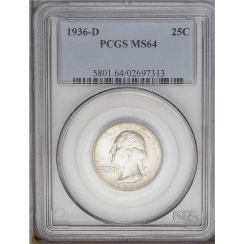 1936-D 25C MS64 PCGS. Hints of gold color are visible 1936-D[25C] MS64 PCGS.