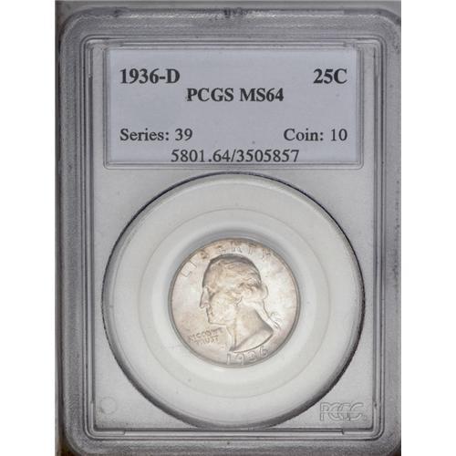 1936-D 25C MS64 PCGS. Pastel shades of lilac, blush, a 1936-D[25C] MS64 PCGS.