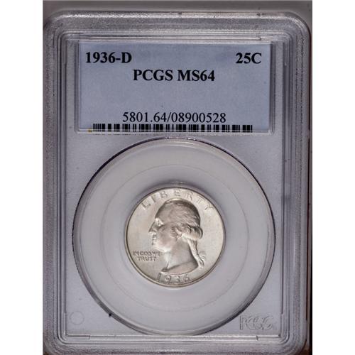 1936-D 25C MS64 PCGS. Well defined beneath blushes of 1936-D[25C] MS64 PCGS.