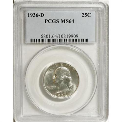<B>1936-D 25C MS64 PCGS.</B></I> A frosty and attractive near-Gem example of this desirable earlier D-mint issue, solidly struck with clean surfaces for the grade. Examples in finer condition are elusive.<BR><BR><B>Coin Engraver:</B> John Flanagan<BR><BR><b>Shipping:</b> Coins & Currency (<a target="_blank" href="http://www.heritageauctions.com/common/shipping.php">view shipping information</a>)