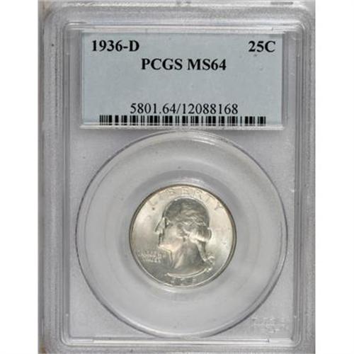 <B>1936-D 25C MS64 PCGS.</B></I> Solidly struck with whispers of silver-gray patina that scarcely dim this D-mint quarter's impressive luster. Minimally marked with a touch of peach on the portrait as well.<BR><BR><B>Coin Engraver:</B> John Flanagan<BR><BR><b>Shipping:</b> Coins & Currency (<a target="_blank" href="http://www.heritageauctions.com/common/shipping.php">view shipping information</a>)