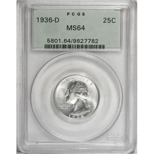 <B>1936-D 25C MS64 PCGS.</B></I> A whisper of olive-tan patina graces this lustrous and suitably struck near-Gem. The reverse is magnificently preserved, and the obverse has only a few faint marks. Housed in a prior generation holder.<BR><BR><B>Coin Engraver:</B> John Flanagan<BR><BR><b>Shipping:</b> Coins & Currency (<a target="_blank" href="http://www.heritageauctions.com/common/shipping.php">view shipping information</a>)