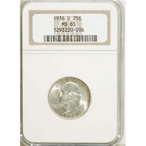 <B>1936-D 25C MS65 NGC.</B></I> Vibrant luster exudes from the nicely preserved surfaces of this D-mint Gem, and an impressive strike results in sharp definition on the design elements. A barely discernible coat of champagne-gold color rests on each side.<BR><BR><B>Coin Engraver:</B> John Flanagan<BR><BR><b>Shipping:</b> Coins & Currency (<a target="_blank" href="http://www.heritageauctions.com/common/shipping.php">view shipping information</a>)