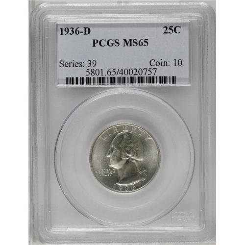 <B>1936-D<25C> MS65 PCGS.</B></I> A brilliant and lustrous Gem example of this important key-date issue. In all grades across the board, the '36-D is considered third in line, behind the 1932-D and S issues, for scarce Washington quarters.