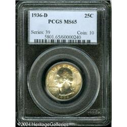 1936-D 25C MS65 PCGS. Chestnut and forest-green co <B>1936-D 25C MS65 PCGS.</B></I> Chestnut and forest-green colors endow the margins of this lustrous better date Gem. Crisply struck, impressive, and worthy of an advanced Registry Set. <BR><BR><B>Important notice:</B> Heritage usually auctions material at the rate of 200-250 lots per hour. On some occasions eBay Live bid software or the Internet may not be able to keep up with the pace of the auction. We recommend placing a realistic absentee bid now as insurance to avoid disappointment. Occasionally the auctioneer may eliminate or reject an eBay Live bid, and the auctioneer may also reopen a lot after the close of the eBay live bidding (usually because we missed an audience bid), and may reject your bid even if it shows you as the winning bidder. By bidding via eBay Live, you agree that Heritage may award the lot to another bidder at its sole discretion under the circumstances described above or any other reasonable circumstances. Since eBay bids are not shown to us until we open the lot on the floor, we treat those bids just like floor bids. In most cases the floor responds before the eBay bid is presented to us, due to Internet lag time, so for consistency we have made it a policy that floor bids are always considered first over tie eBay live bids. Also please note that all Heritage lots purchased through eBay Live carry a 20% Buyer's Premium. Please make sure you read the Terms and Conditions before you bid. This lot is being auctioned in conjunction with a live floor auction by Heritage Galleries & Auctioneers. All final auction and invoice information will be supplied by Heritage Galleries & Auctioneers, and all other information should be considered preliminary. Lot:6000