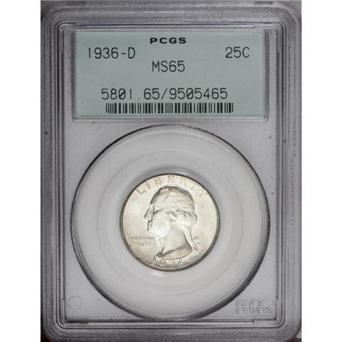 <B>1936-D<25C> MS65 PCGS.</B></I> Light olive-gold visits the fields of this lustrous and reasonably preserved Gem. Well struck in the centers; peripheral legends show some fadeaway. A famous conditional rarity within the series. Certified in a green label holder.