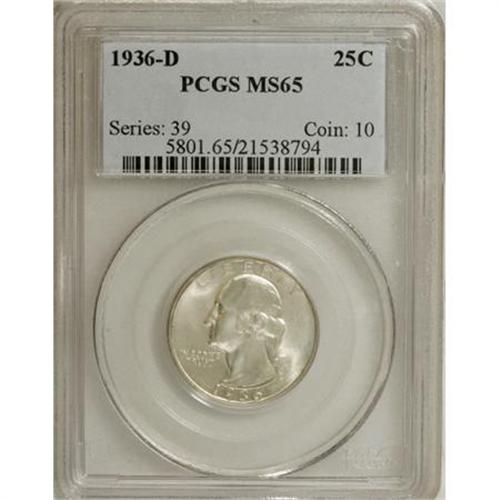 <B>1936-D 25C MS65 PCGS.</B></I> Well struck with pleasing silver-gray coloration on both sides. This satiny, appealing Gem shows no flaws of note, an unusual state for this often-elusive Denver issue.<BR><BR><B>Coin Engraver:</B> John Flanagan<BR><BR><b>Shipping:</b> Coins & Currency (<a target="_blank" href="http://www.heritageauctions.com/common/shipping.php">view shipping information</a>)
