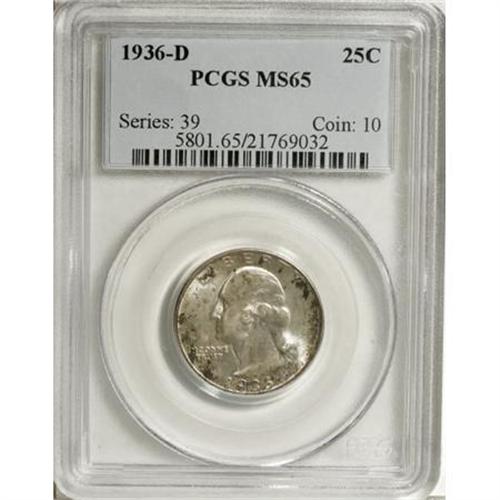 <B>1936-D 25C MS65 PCGS.</B></I> Splashes of reddish-brown and sage patina grace the obverse margins, though the surfaces are untoned elsewhere. Pleasingly detailed and shining, a lovely Gem representative of this early D-mint issue.<BR><BR><B>Coin Engraver:</B> John Flanagan<BR><BR><b>Shipping:</b> Coins & Currency (<a target="_blank" href="http://www.heritageauctions.com/common/shipping.php">view shipping information</a>)