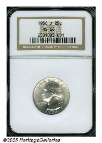 <B>1936-D<25C> MS66 NGC.</B></I> The original mintage of this issue is 5.3 million coins--a total that is not unusually low for a branch mint Washington Quarter from this era. Nevertheless, the '36-D is a well known semi-key date that becomes progressively more difficult to locate with grade. Creamy-white surfaces, both the obverse and reverse are awash in scintillating mint luster. There do not appear to be any abrasions that would bar this coin from an even higher grade. A Gem that is sure to delight the specialist.