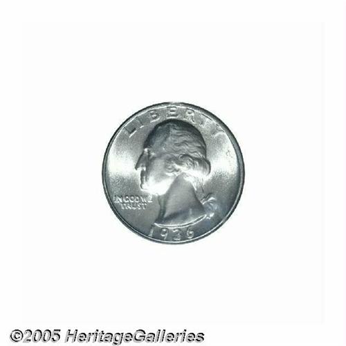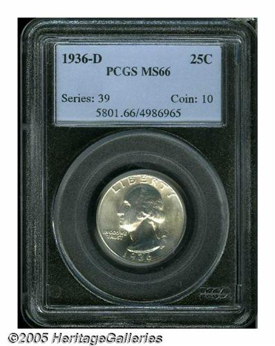 <B>1936-D<25C> MS66 PCGS.</B></I> A lightly toned Gem that has faint apricot color on the obverse field and an essentially untoned reverse. The strike is bold, not only in the centers but also on most of the peripheral legends. The luster is booming, and thorough scrutiny of the surfaces fails to reveal even a remotely mentionable distraction. Although readily available in circulated grades, the 1936-D is the most important conditional rarity of this popular series. A splendid Gem that would be a fine addition to the highest quality Registry Set. Population: 101 in 66, 8 finer (6/05).