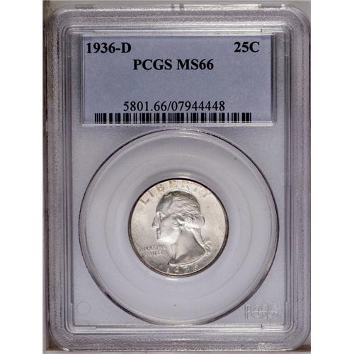 <B>1936-D<25C> MS66 PCGS.</B></I> An average strike with a touch of golden toning. The surfaces display a few minor abrasions to the well-trained eye and the obverse fields exhibit a high degree of reflectivity. An original Gem example of this conditionally scarce issue. Population: 118 in 66, 8 finer (3/06).