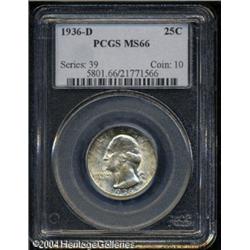 1936-D 25C MS66 PCGS. Splendid peach-gold and blue <B>1936-D 25C MS66 PCGS.</B></I> Splendid peach-gold and blue iridescent toning partially overlays the frosty surfaces. Both the strike and surface quality of this well documented Washington Quarter scarcity are virtually unimprovable. Population: 88 in 66, 8 finer (11/04). <BR><BR><B>Important notice:</B> Heritage usually auctions material at the rate of 200-250 lots per hour. On some occasions eBay Live bid software or the Internet may not be able to keep up with the pace of the auction. We recommend placing a realistic absentee bid now as insurance to avoid disappointment. Occasionally the auctioneer may eliminate or reject an eBay Live bid, and the auctioneer may also reopen a lot after the close of the eBay live bidding (usually because we missed an audience bid), and may reject your bid even if it shows you as the winning bidder. By bidding via eBay Live, you agree that Heritage may award the lot to another bidder at its sole discretion under the circumstances described above or any other reasonable circumstances. Since eBay bids are not shown to us until we open the lot on the floor, we treat those bids just like floor bids. In most cases the floor responds before the eBay bid is presented to us, due to Internet lag time, so for consistency we have made it a policy that floor bids are always considered first over tie eBay live bids. Also please note that all Heritage lots purchased through eBay Live carry a 20% Buyer's Premium. Please make sure you read the Terms and Conditions before you bid. This lot is being auctioned in conjunction with a live floor auction by Heritage Galleries & Auctioneers. All final auction and invoice information will be supplied by Heritage Galleries & Auctioneers, and all other information should be considered preliminary. Lot:6001