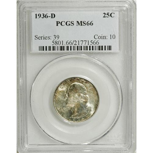 <B>1936-D 25C MS66 PCGS.</B></I> Splendid peach-gold and blue iridescent toning partially covers the frosty surfaces. Both the strike and surface quality of this well-documented Washington quarter scarcity are virtually unimprovable. PCGS has graded only nine coins finer (1/07).<BR><BR><b>Shipping:</b> Coins & Currency (<a target="_blank" href="http://www.heritageauctions.com/common/shipping.php">view shipping information</a>)