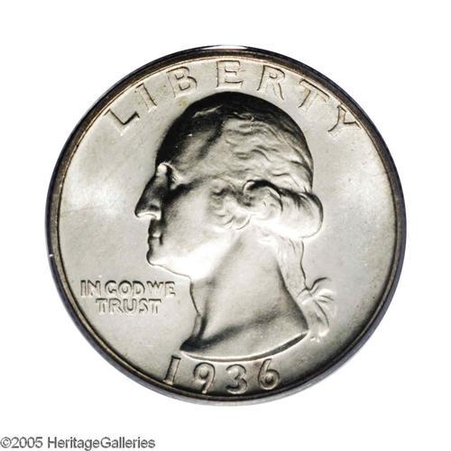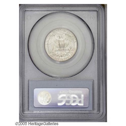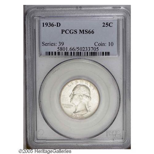 <B>1936-D<25C> MS66 PCGS.</B></I> The original mintage of this issue is 5.3 million coins--a total that is not unusually low for a branch mint Washington Quarter from this era. Nevertheless, the '36-D is a well known semi-key date that becomes progressively more difficult to locate with grade. This Premium Gem exhibits lustrous surfaces visited by barely discernible wisps of light tan color, and is well struck on the design features. A couple of miniscule marks on Washington's jaw do not detract in the least. Population: 109 in 66, 8 finer (11/05).