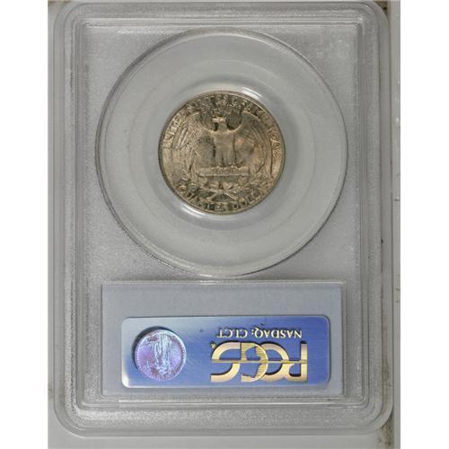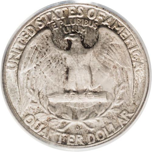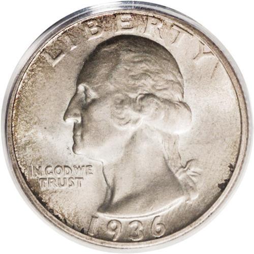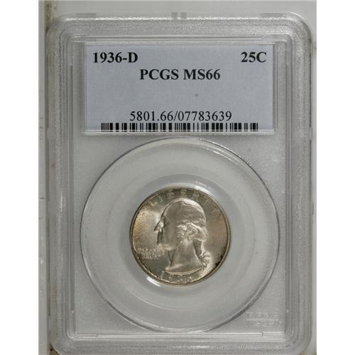 <B>1936-D<25C> MS66 PCGS.</B></I> This is a scarce key date issue that is rare any finer. Fully struck and satiny, with lovely dove-gray toning which shows a slight overlay of copper-orange patina on the reverse, and yields to speckled olive and peach toning near the left obverse periphery. Immaculately preserved from coin-to-coin contact, but a wispy fingerprint fragment near the date area denies perfection.