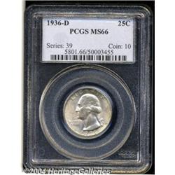 <B>1936-D<25C> MS66 PCGS.</B></I> Honey-gold and silver-gray colors enrich this lustrous and unmarked premium Gem. The 1936-D is among the most elusive business strike issues in better Mint State grades. Q. David Bowers has speculated that contemporary collectors were too busy chasing the dozens of Silver Commemorative issues to set aside Uncirculated examples. Population: 73 in 66, 7 finer (3/04). <BR><BR><B>Important notice:</B> Heritage usually auctions material at the rate of 200-250 lots per hour. On some occasions eBay Live bid software or the Internet may not be able to keep up with the pace of the auction. We recommend placing a realistic absentee bid now as insurance to avoid disappointment. Occasionally the auctioneer may eliminate or reject an eBay Live bid, and the auctioneer may also reopen a lot after the close of the eBay live bidding (usually because we missed an audience bid), and may reject your bid even if it shows you as the winning bidder. By bidding via eBay Live, you agree that Heritage may award the lot to another bidder at its sole discretion under the circumstances described above or any other reasonable circumstances. Since eBay bids are not shown to us until we open the lot on the floor, we treat those bids just like floor bids. In most cases the floor responds before the eBay bid is presented to us, due to Internet lag time, so for consistency we have made it a policy that floor bids are always considered first over tie eBay live bids. Also please note that all Heritage lots purchased through eBay Live carry a 20% Buyer's Premium. Please make sure you read the Terms and Conditions before you bid. </span></font></tr></table></td></tr></table>