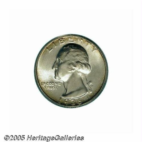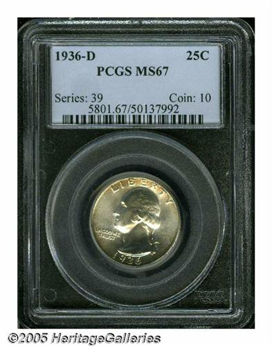 <B>1936-D<25C> MS67 PCGS.</B></I> This is one of the finest seen of this scarce and popular date. The luster is radiant throughout and we note delicate gold peripheral toning on the obverse, while the reverse sports some pastel blue intermixed with gold. Fully struck by the dies, with no weakness seen. A strong loupe will note a tiny tick on the edge of the truncation, right of the 6 in the date, and another minute tick on Washington's jaw, and these are noted to help identify this splendid coin in the future. On the reverse, only minute scuffs are seen on the thighs of the eagle, and a subtle tick resides on the edge of the wing below the right side of the E in AMERICA. It would be hard to imagine a finer example of this important and elusive date. Such quality will delight even the most advanced specialist of the series, and this coin is worthy of the finest Registry or date collection. Population: 8 in 67, 0 finer (6/05).