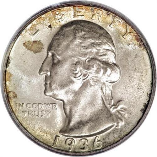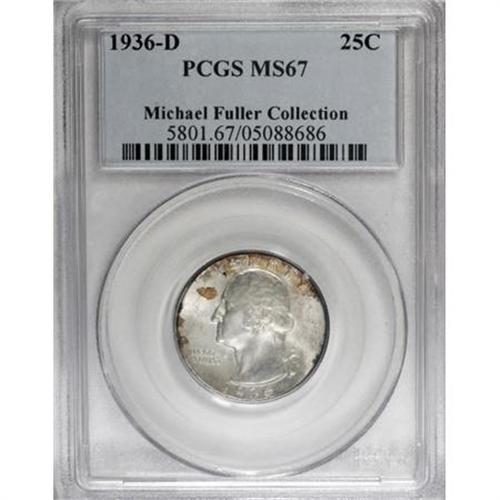 <B>1936-D 25C MS67 PCGS.</B></I> The 1936-D Washington quarter is third in line for rarity behind only the 1932-D and 1932-S issues. Most of the mintage, in excess of 5 million coins, must have immediately entered circulation as Mint State coins are all scarce today, perhaps because collectors of the day concentrated their efforts on the proliferation of silver commemorative issues that year. This Superb Gem has frosty luster with mostly brilliant silver surfaces, accented by splashes of gold and iridescent toning on the obverse. Among the finest certified by PCGS, and infrequently available at this grade level. Population: 9 in 67, none are finer (10/07).<BR><I>From The Michael Fuller Collection.</B></I><BR><BR><B>Coin Engraver:</B> John Flanagan<BR><BR><b>Shipping:</b> Coins & Currency (<a target="_blank" href="http://www.heritageauctions.com/common/shipping.php">view shipping information</a>)