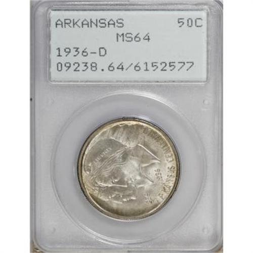 <B>1936-D 50C Arkansas MS64 PCGS.</B></I> . PCGS Population (536/580). NGC Census: (309/382). Mintage: 9,660. Numismedia Wsl. Price for NGC/PCGS coin in MS64: $95. (#9238)<BR><BR><b>Shipping:</b> Coins & Currency (<a target="_blank" href="http://www.heritageauctions.com/common/shipping.php">view shipping information</a>)