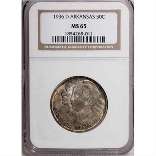 <B>1936-D 50C Arkansas MS65 NGC.</B></I> NGC Census: (300/73). PCGS Population (362/189). Mintage: 9,660. Numismedia Wsl. Price for NGC/PCGS coin in MS65: $200. (#9238)<BR><I>From The Frank DuVall Collection of U.S. Commemoratives.</B></I><BR><BR><b>Shipping:</b> Coins & Currency (<a target="_blank" href="http://www.heritageauctions.com/common/shipping.php">view shipping information</a>\)