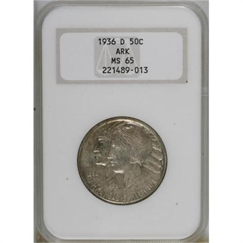 <B>1936-D 50C Arkansas MS65 NGC.</B></I> NGC Census: (305/78). PCGS Population (378/204). Mintage: 9,660. Numismedia Wsl. Price for NGC/PCGS coin in MS65: $170. (#9238)<BR><BR><b>Shipping:</b> Coins & Currency (<a target="_blank" href="http://www.heritageauctions.com/common/shipping.php">view shipping information</a>)