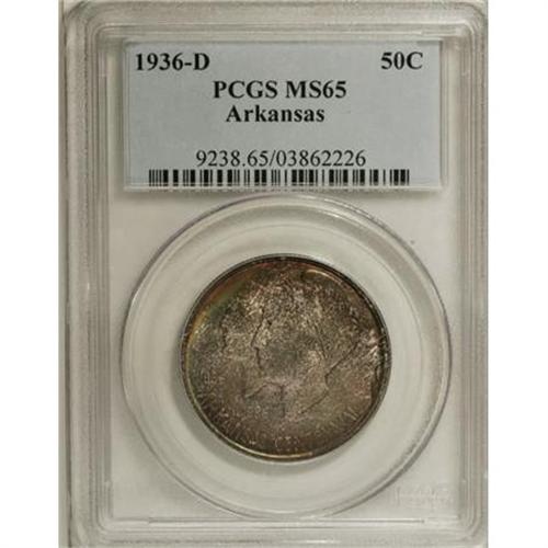 <B>1936-D 50C Arkansas MS65 PCGS.</B></I> PCGS Population (362/189). NGC Census: (296/73). Mintage: 9,660. Numismedia Wsl. Price for NGC/PCGS coin in MS65: $200. (#9238)<BR><BR><b>Shipping:</b> Coins & Currency (<a target="_blank" href="http://www.heritageauctions.com/common/shipping.php">view shipping information</a>)
