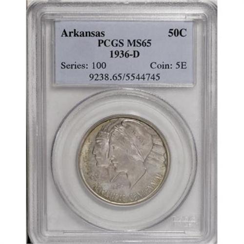 <B>1936-D 50C Arkansas MS65 PCGS.</B></I> . PCGS Population (377/203). NGC Census: (302/79). Mintage: 9,660. Numismedia Wsl. Price for NGC/PCGS coin in MS65: $180. (#9238)<BR><BR><b>Shipping:</b> Coins & Currency (<a target="_blank" href="http://www.heritageauctions.com/common/shipping.php">view shipping information</a>)