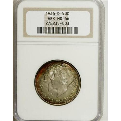 <B>1936-D 50C Arkansas MS66 NGC.</B></I> PCGS Population (171/18). NGC Census: (63/10). Mintage: 9,660. Numismedia Wsl. Price for NGC/PCGS coin in MS66: $600. (#9238)<BR><BR><b>Shipping:</b> Coins & Currency (<a target="_blank" href="http://www.heritageauctions.com/common/shipping.php">view shipping information</a>)