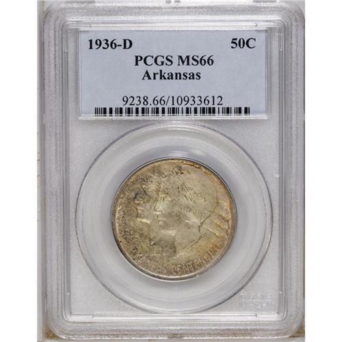 <B>1936-D 50C Arkansas MS66 PCGS.</B></I> A luminous Premium Gem from an original mintage of just 9,660 pieces. Dove-gray, gold, russet, and dark violet patina covers each side.<BR><BR><b>Shipping:</b> Coin/Currency (<a target="_blank" href="http://www.heritageauctions.com/common/shipping.php">view shipping information</a>)