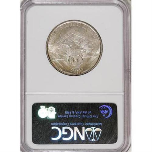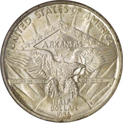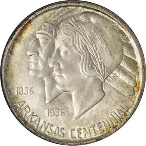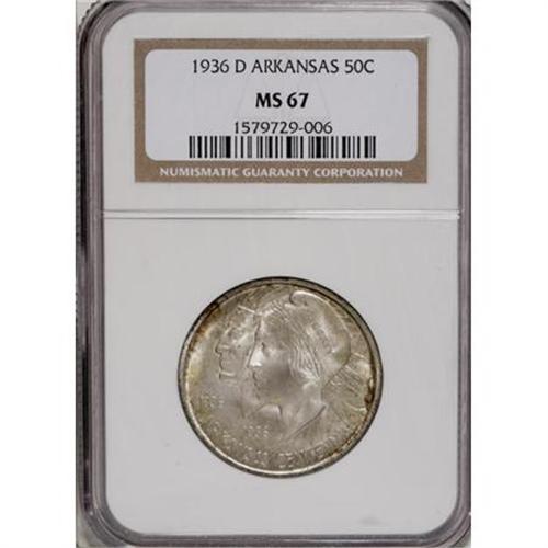 <B>1936-D 50C Arkansas MS67 NGC.</B></I> Delicate olive-green and powder-blue dominate this shimmering Superb Gem, although red-orange freckles congregate along portions of the rims. Liberty's cheekbone has faint contact, but the surfaces are otherwise essentially immaculate. Census: 9 in 67, 2 finer (11/07).<BR><BR><b>Shipping:</b> Coins & Currency (<a target="_blank" href="http://www.heritageauctions.com/common/shipping.php">view shipping information</a>)