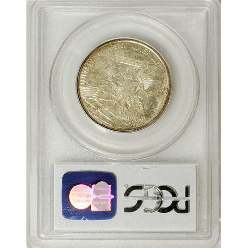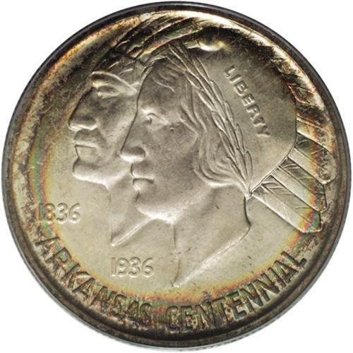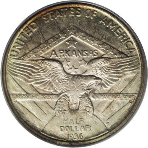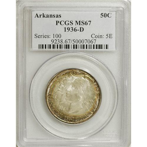 <B>1936-D 50C Arkansas MS67 PCGS.</B></I> Artist Emily Bates crafted the models for the Arkansas commemoratives after designs rendered by Edward Everett Burr, a man who was born in Ohio, moved to Arkansas as a child, and found his life's work in Chicago, where he had received formal training. His collected papers are in the possession of the University of Arkansas Libraries, Special Collections. This exquisitely preserved half dates to the year of the actual centennial, 1936. The obverse has a grand orange-russet crescent centered at the lower left, while silver-gray patina covers the remainder of the coin. Population: 18 in 67, 0 finer (3/07).<BR><I>From The Cary & Cheryl Porter Collection.</B></I><BR><BR><b>Shipping:</b> Coins & Currency (<a target="_blank" href="http://www.heritageauctions.com/common/shipping.php">view shipping information</a>)
